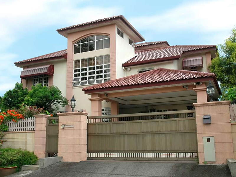 Please stand on the front, facing your house and capture all areas like Body, Border, Pillars, grills etc. in the image.